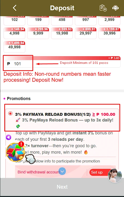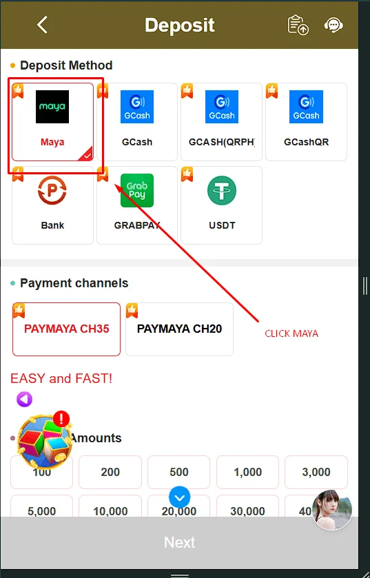 Step 2: Choose MAYA for your payment method and enter the amount you want to deposit (minimum of 101 pesos)